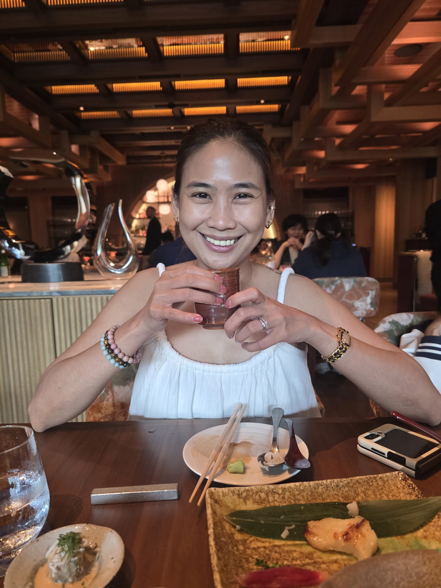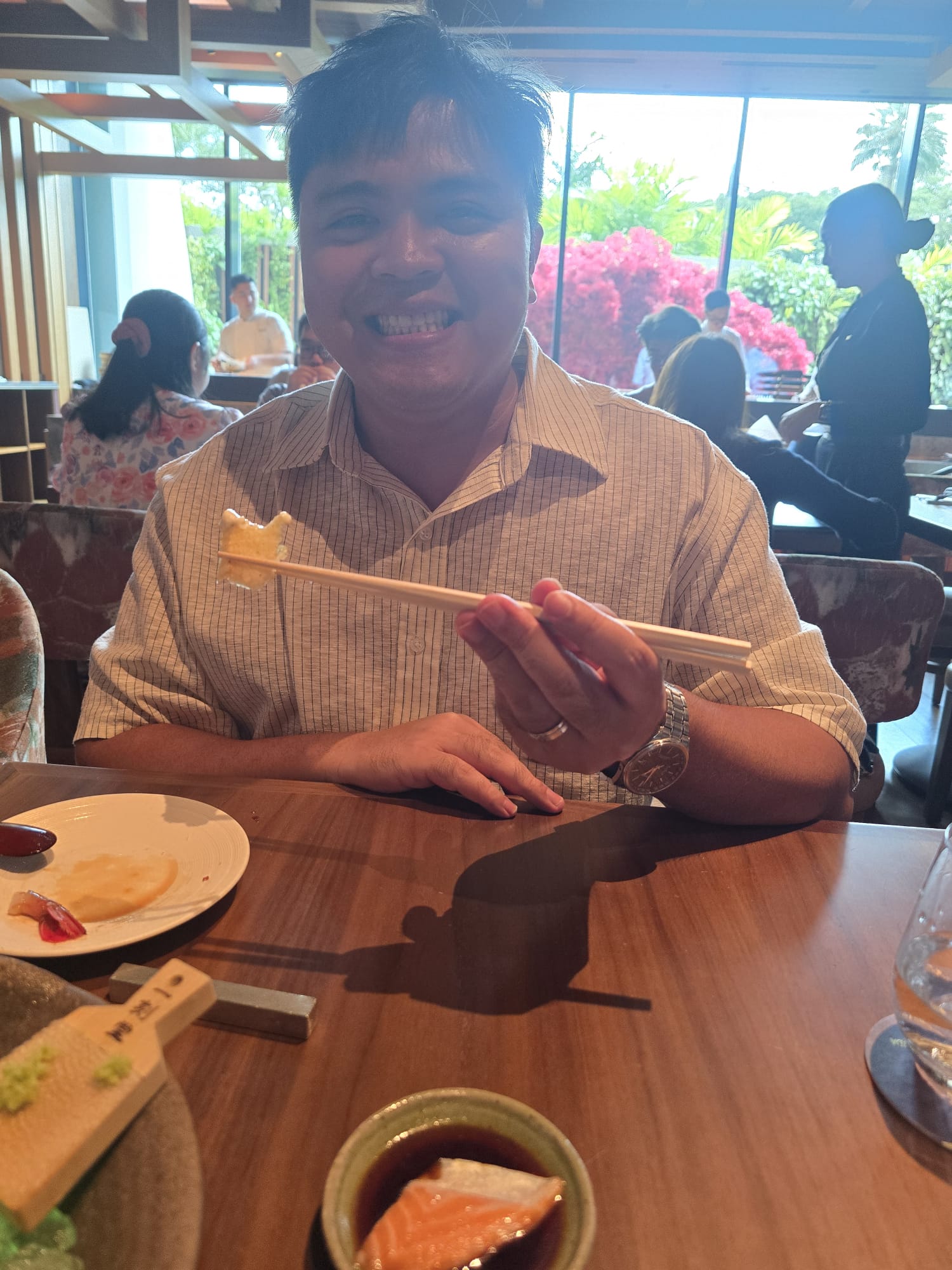 We celebrated our anniversary last year at Wakuda in Marina Bay Sands. During that time, there was a special Wagyu steak that was quite expensive, but we thought “hey, we’re celebrating our 10th wedding anniversary, we should enjoy it.” It arrived as a steak cut into eight cubes. Che got one, I got one, and Vino got the rest. He wanted more, but we said it’s too expensive to order again.